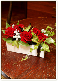 バラをメインに使ったアレンジメント。ギフトBOXに入って、コンパクトでかわいらしい印象です。