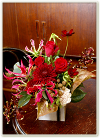情熱的な赤でまとめたアレンジメント。恋人へのプレゼントに…。